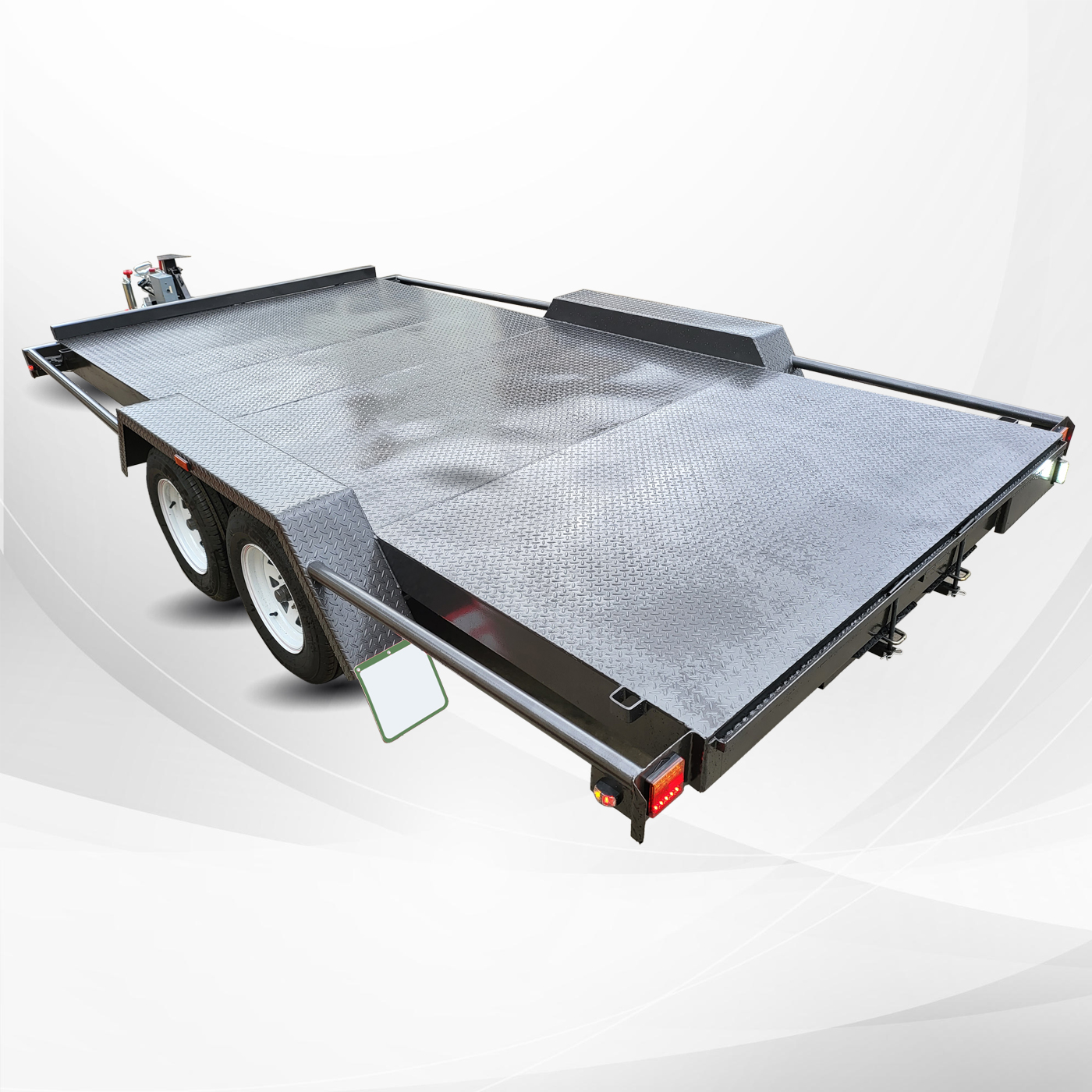 Robust 14 × 6 ft 6″ tandem-axle semi-flat car carrier trailer, available in 2.8 T ATM (with 4-wheel electric brakes) or 2.0 T ATM (front-axle hydraulic brakes) configurations. Features include checker-plate deck, twin 7 ft slide-under ramps, tie rails, winch post, jockey wheel, Sunraysia wheels, and LED lighting. Fully Australian-made—kindly confirm specs when ordering.