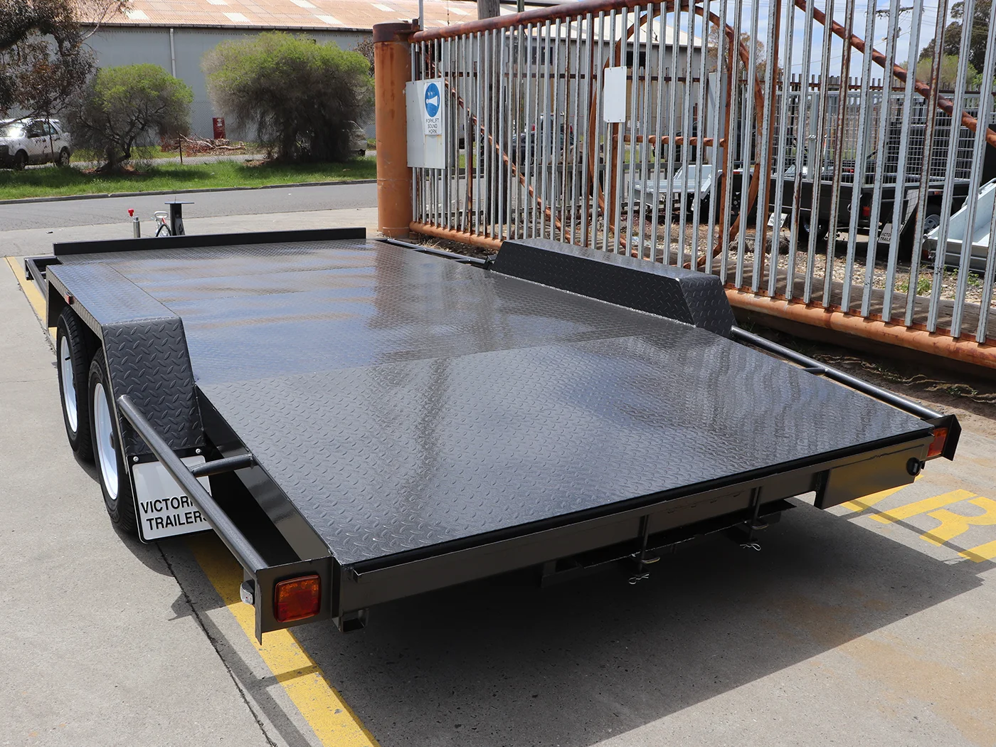 Heavy-duty 14×6’6″ tandem-axle beaver-tail car carrier trailer, rated at 2,800 kg ATM. Features include 4‑wheel electric brakes with break-away system, rocker roller suspension, checker-plate deck & guards, integrated beaver tail, slide-under ramps, tie rails, winch post, Sunraysia wheels, and ADR-compliant LED lighting. Fully Australian-made. Please verify specifications when ordering.