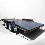Tandem axle 14×6 ft 6″ beaver tail car carrier trailer with 3,200 kg ATM, rocker roller suspension, electric brakes, checker plate deck, and slide-in ramps. Built tough with extended drawbar and multiple tie-downs for reliable vehicle transport. Kindly verify specifications when ordering.