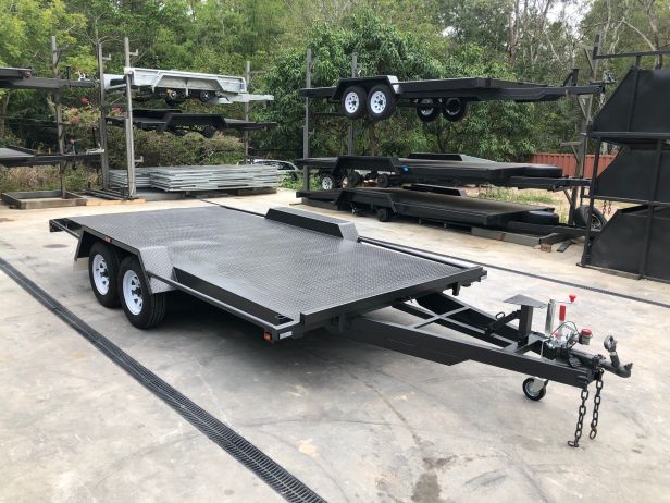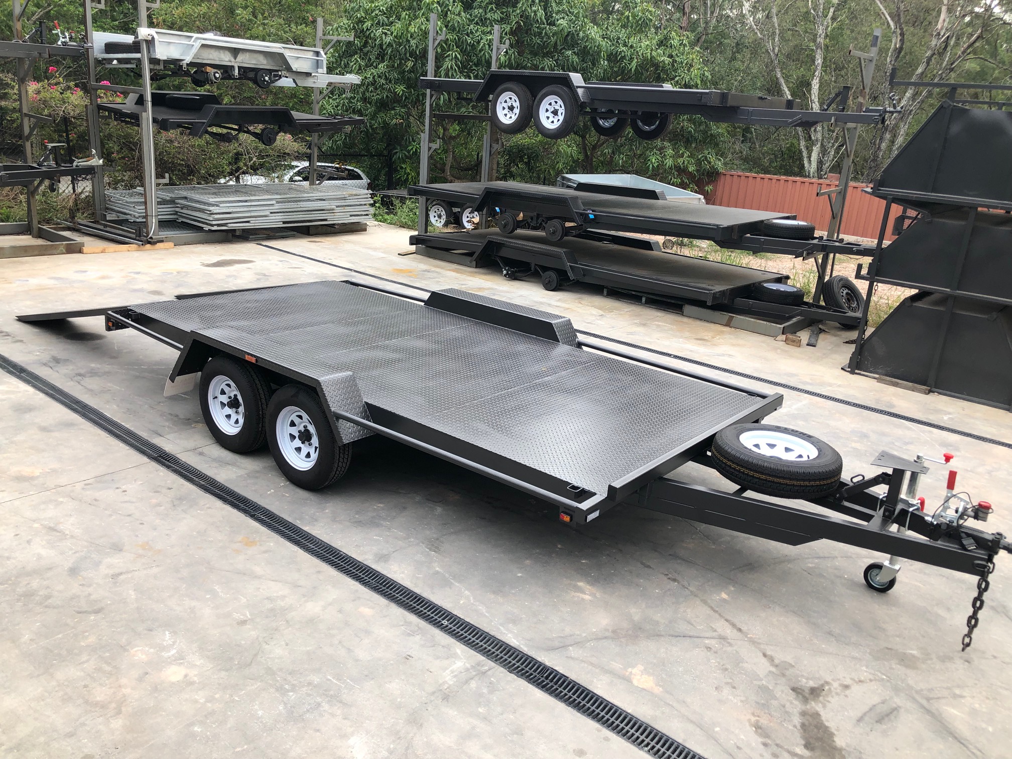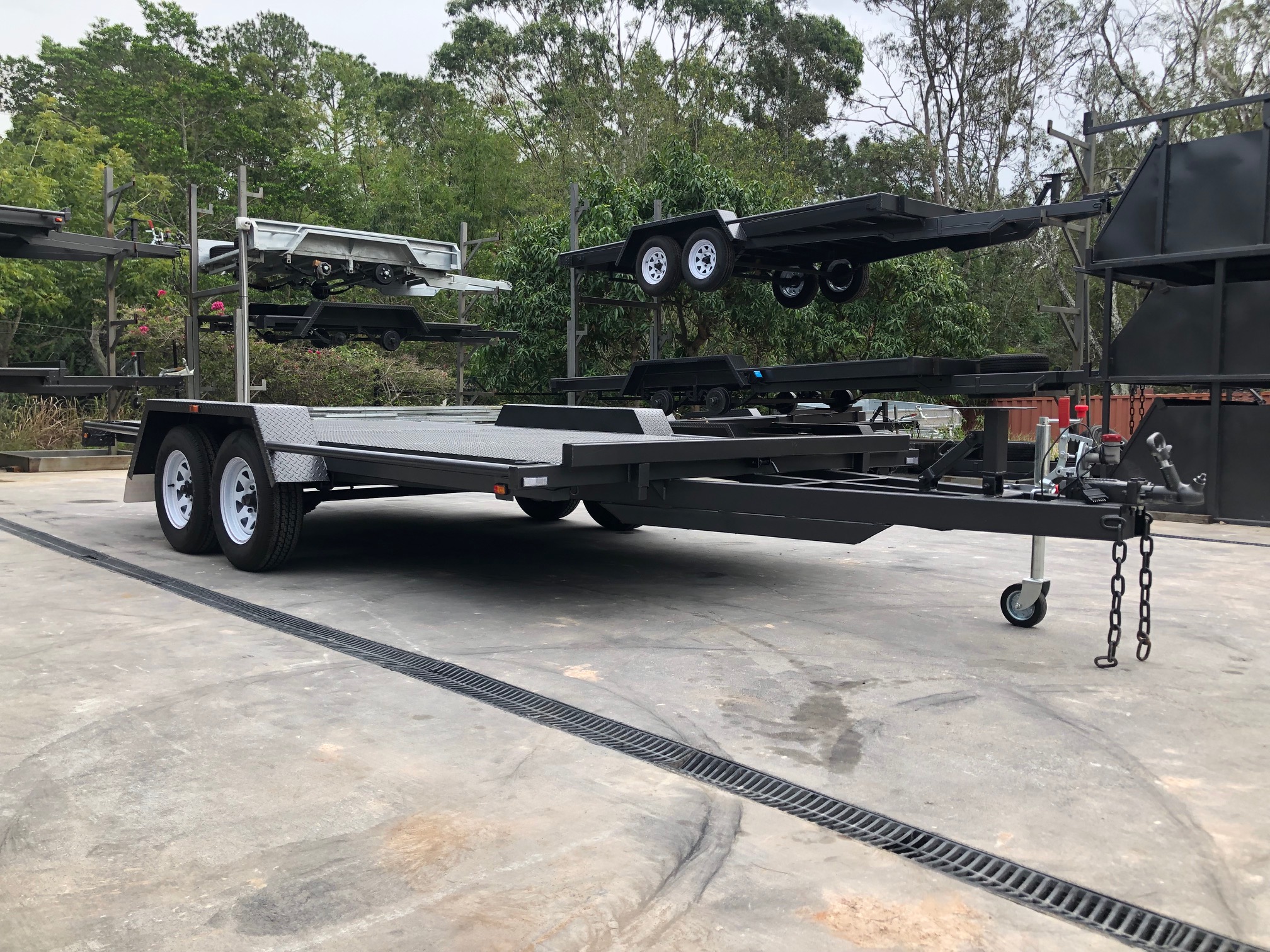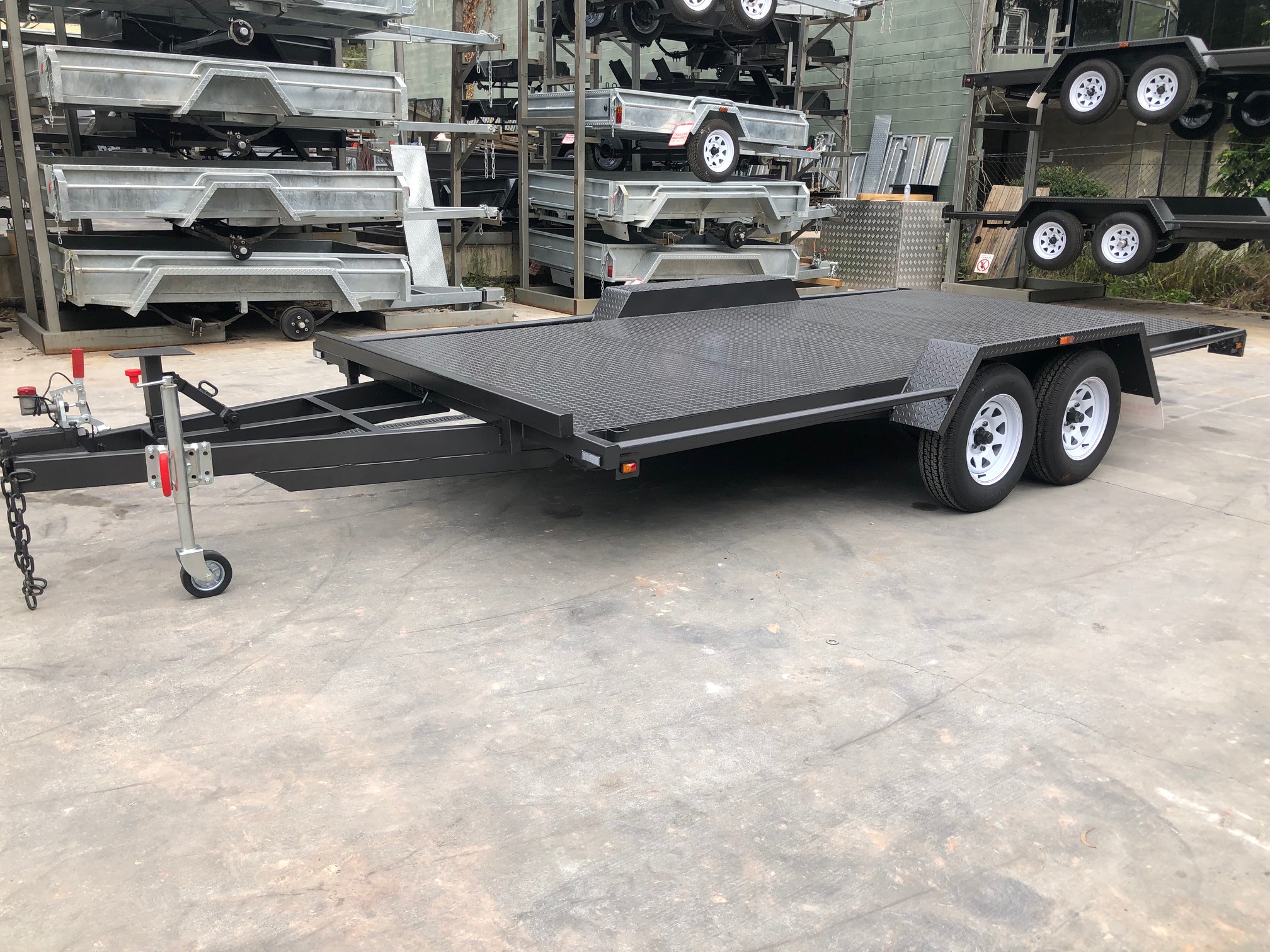 Australian-made 14×6 ft 6″ tandem-axle semi-flat car carrier trailer with 2,800 kg ATM (also available in 2,000 kg hydraulic-braked variant). Features include electric braking on all wheels with break-away unit, checker-plate floor and guards, rocker-roller suspension, twin 7 ft slide-under ramps, tie rails, winch post, and LED lights. Please verify specs when ordering.
