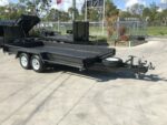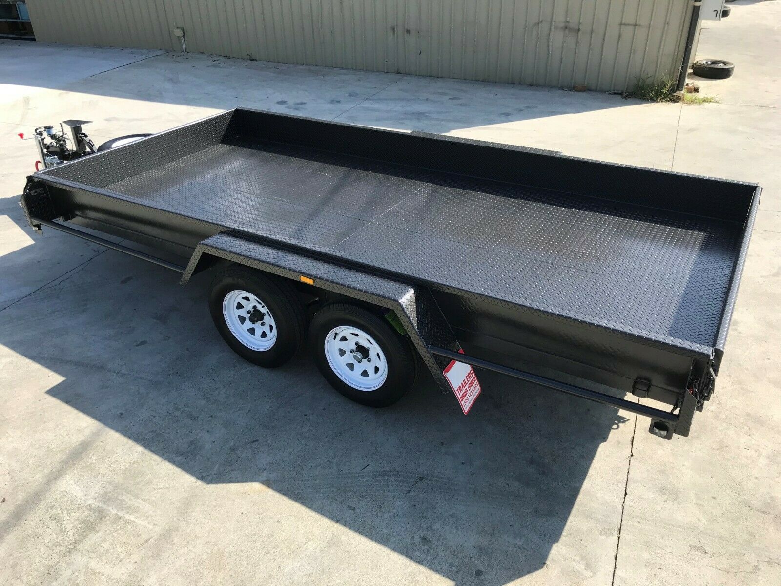 Australian-made 14 × 6 ft 6″ tandem-axle box car carrier trailer with 1,990 kg ATM. Features 10″ boxed sides plus rear tailgate and front stop bar, hydraulic front brakes (upgradeable to electric), slipper suspension, checker-plate body, winch post, slide-under ramps, tie rails, Sunraysia wheels, and LED lighting. Ideal for robust and secure vehicle transport.