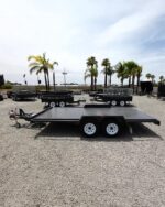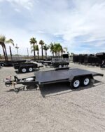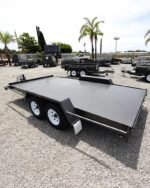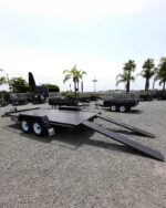 14×6’6″ semi flat top car carrier trailer with 2000kg ATM, tandem axle setup, electric brakes, checker plate floor, and tie down rails. Kindly verify specifications when ordering.