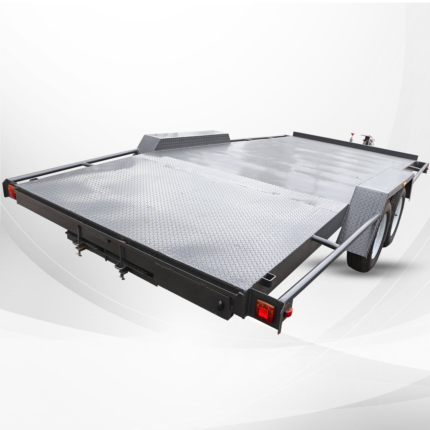 16×6’6″ tandem axle semi flat car carrier trailer with built-in beaver tail, electric brakes, heavy-duty rocker suspension, and 3,200 kg ATM. Hot-dip galvanised with long ramps for vehicle loading. Kindly verify specifications when ordering.