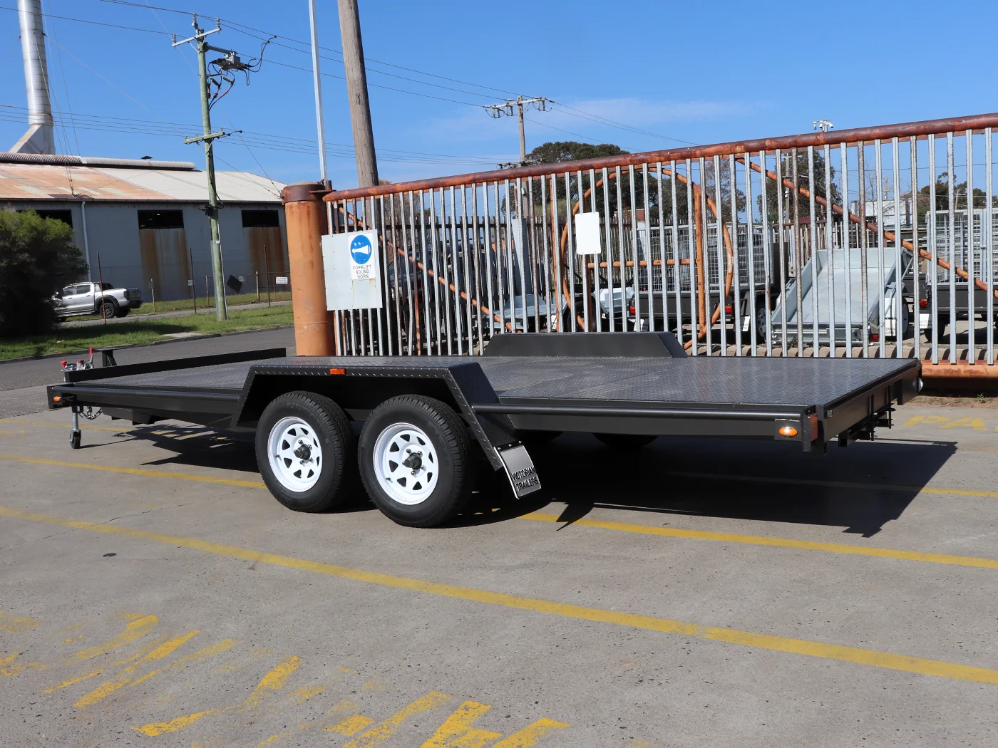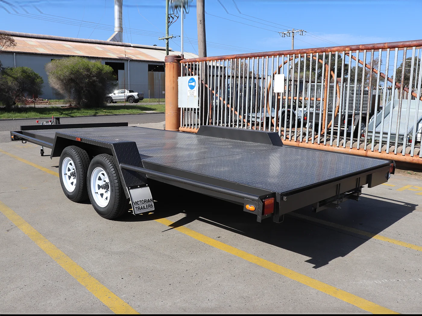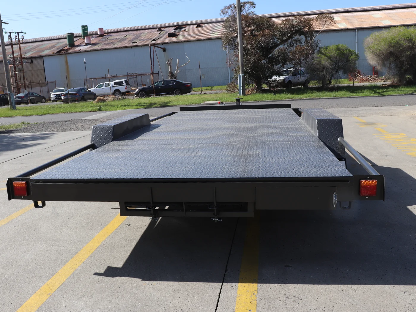16×6 ft 6″ tandem-axle semi‑flat car carrier trailer rated at 2,000 kg ATM (with hydraulic or optional electric brakes on the front axle). Features include slipper‑leaf suspension, checker‑plate deck and guards, twin 7 ft slide‑under ramps, tie rails, winch post, front stop bar, jockey wheel, ADR‑compliant LED lighting, and Sunraysia rims. Australian-made and ideal for light-duty vehicle transport. Kindly verify details when ordering.